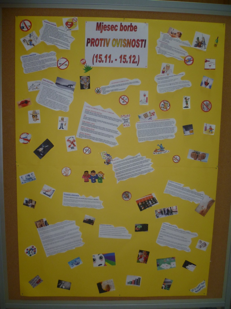 Povodom Mjeseca borbe protiv ovisnosti učenici multimedijalne grupe "MultiGenijalci" i nastavnica informatike Dona Prović izradili su edukativni pano na kojem su ukazali na prevenciju te posljedice tih bolesti (pušenje, alkohol, droga, kockanje, internet...).