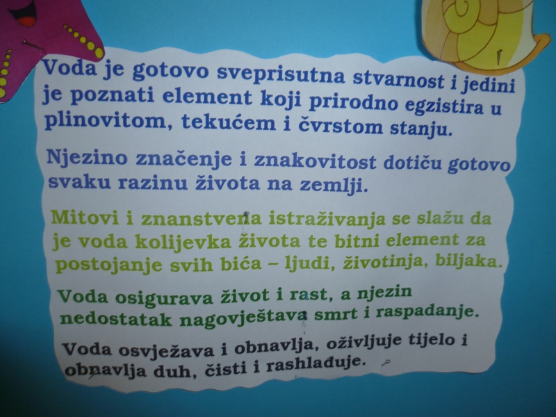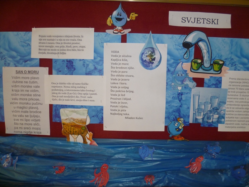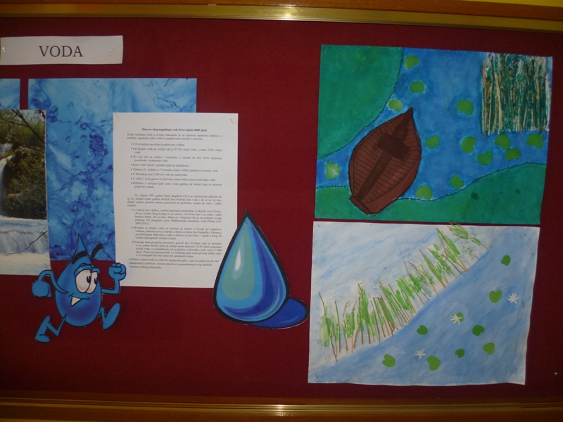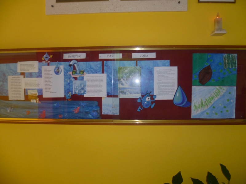 Koliko nam je voda važna i potrebna, te kako bez nje ne možemo živjeti, prikazala su djeca prigodnim panoima: skupina „Multigenijalci“ nastavnice Done Prović, likovne skupine nastavnica Marije Čupić-Senta i Višnje Grančić i fotografije posvećene Svjetskom danu voda učenice Dore Boban iz VIII. c pod vodstvom nastavnice Monike Bušurelo.
