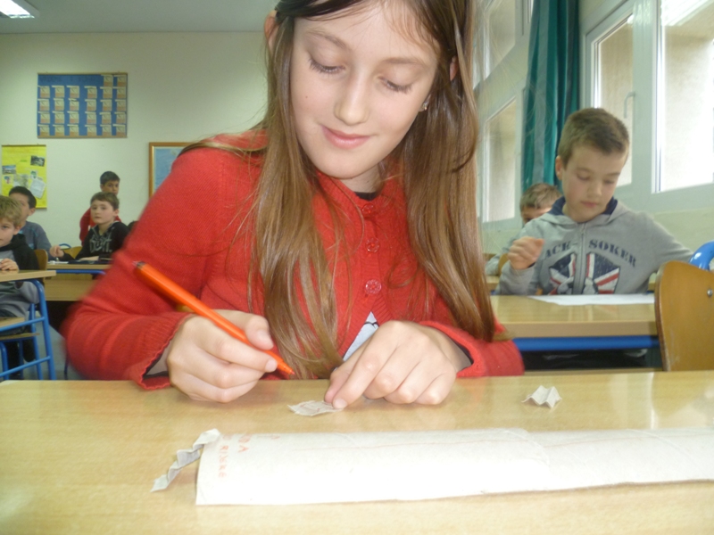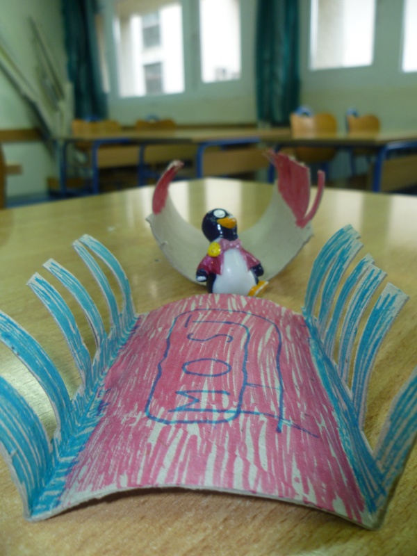 4. Ispričana im je priča o malom pingvinu koji zbog topljenja leda mora napustiti svoj dom i seli se. Ima jako puno potoka i rijeka, pa oni mu moraju sagraditi most preko kojeg bi pingvin mogao prelaziti sve te vode da se spasi. Kao materijali koristile su se samo škare i tuljak od kartona (od wc papira).