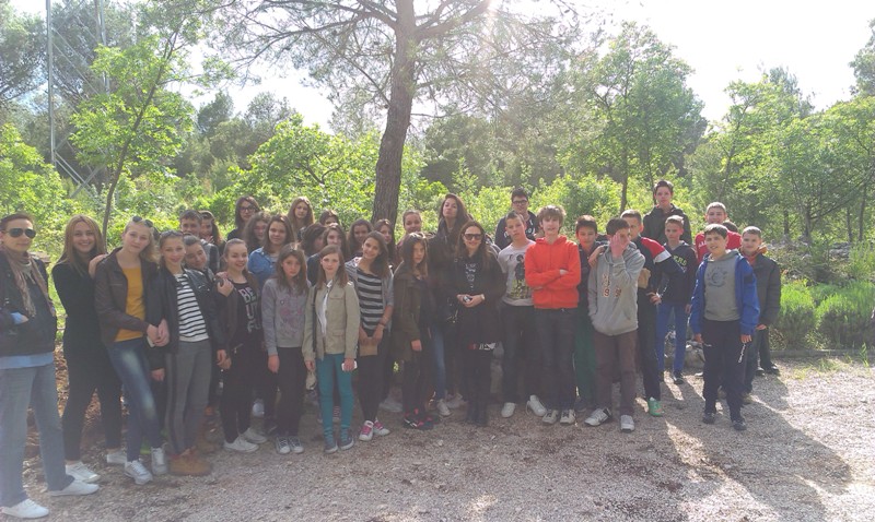 Prvo odredište je bio Botanički vrt OŠ „Ostrog“ u Kaštel Lukšiću. Tamo su nas dočekala dva vodiča s kojima smo, podijeljeni u dvije grupe, krenuli u obilazak školskog Botaničkog vrta. Vodič nam je pokazao brojne biljke iz raznih dijelova svijeta koje su smještene oko njihove škole. Vidjeli smo crvenu šljivu, kokos, papirus, kraljevsku palmu, Biblijski vrt i mnoge druge biljke. Najzanimljivije stablo većini je bilo majmunsko stablo jer je jedino stablo na koje se majmun ne može popeti zbog velikih bodlja. Škola o ovom veličanstvenom vrtu brine još od 1976. godine.