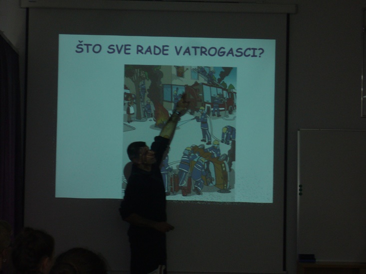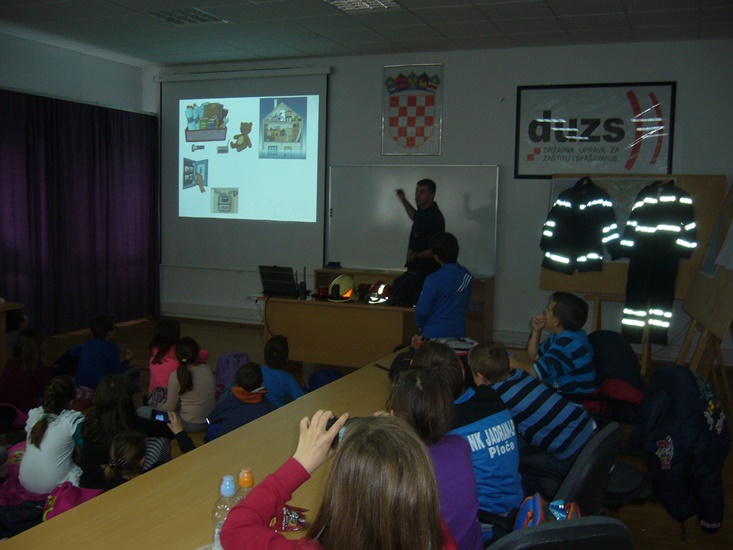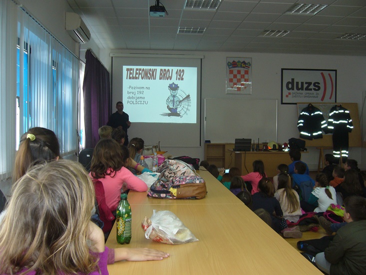 Tu su nas dočekali zaposlenici Državnog ureda za zaštitu i spašavanje i održali nam edukativno predavanje o sigurnosti i zaštiti u svakodnevom životu i prezentirali svoju opremu.I učiteljica Višnja se okušala u oblačenju vatrogasne opreme.