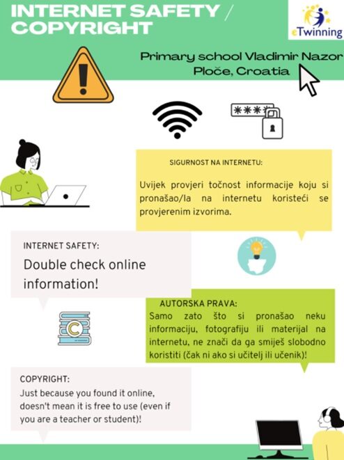 Učiteljica Ivana Pudar Pećar odradila je s učenicima sedmih razreda radionicu Internet Safety/Copyright te su na istu temu učenici izrađivali digitalne plakate, a najuspješniji je podijeljen s partnerima na Twinspaceu.