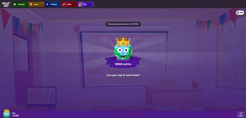 Na Natjecanju u financijskoj pismenosti, održanom 5. 3. putem online platforme Kafoot!, natjecalo se 1590 učenika, tj. 530 prijavljenih ekipa iz RH, a tim 8. b iz naše škole osvojio je 6. mjesto!
